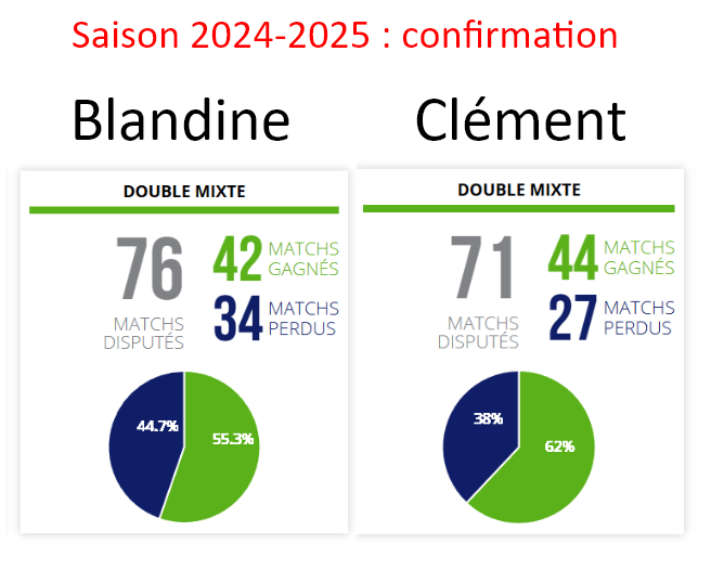 Acteurs importants de la montée de l’équipe 1 en R2, ils peuvent désormais se frotter à des paires encore meilleures, et commencer à challenger quelques N3, voire N2. On aurait pu croire qu’ils marqueraient un coup d’arrêt et qu’ils trouveraient leur plafond, mais il semble que ce ne soit pas encore prévu, puisque les succès s’enchainent, et, ça y est, le N3 est atteint. Le 24 octobre 2024 pour Blandine, le jour de ses 27 ans et demi ! Elle est rapidement suivie par Clément le 21 novembre 2024, 5 jours avant qu’il ne fête ses 26 ans.