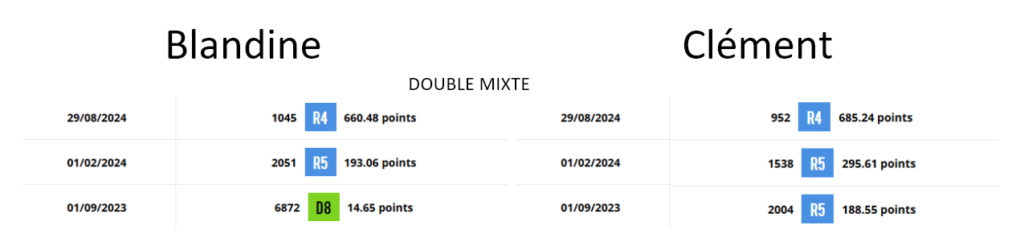 La saison 2023-2024 lance donc leur ascension, avec un taux de victoire en mixte de presque 80% pour Blandine qui passe de 15 à 660 points en une année. Le R4 est validé, et des rêves de N3 prennent forme peu à peu…