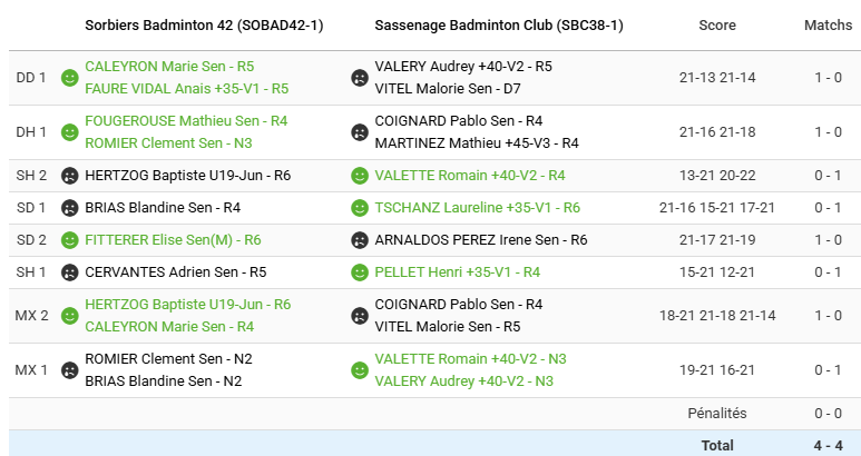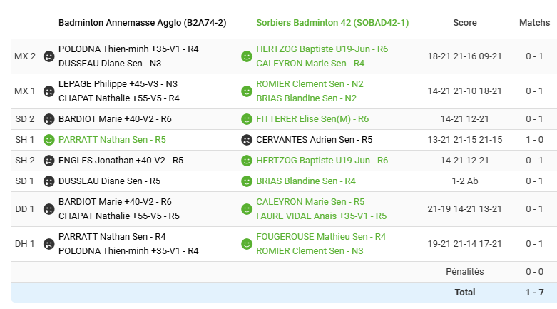 Face à Annemasse, lanterne rouge de cette poule de R2, il faut absolument empocher une victoire pour se donner un peu d’air au classement. La compo du matin, après avoir fait ses preuves, est reconduite à l’identique, mais cette fois-ci on commence par les mixtes.