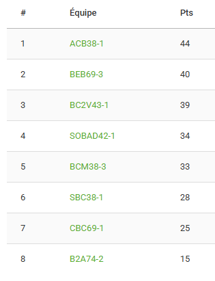 8 points de plus au classement, c’est une belle journée pour l’équipe 1 qui conserve sa 4ème place et prend un peu de marge avec la zone rouge. Avec 5 points de retard sur la 3ème place et 6 points d’avance sur la 6ème, nous voilà plus proche des barrages de montée que des barrages de descente ! Il faudra continuer à scorer si nous voulons nous maintenir, et ça commence par de bonnes performances lors de la prochaine journée à Meylan le 22 février face à Brives-Charensac (3ème) et Bron (2ème), deux adversaires de taille !