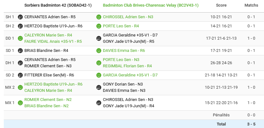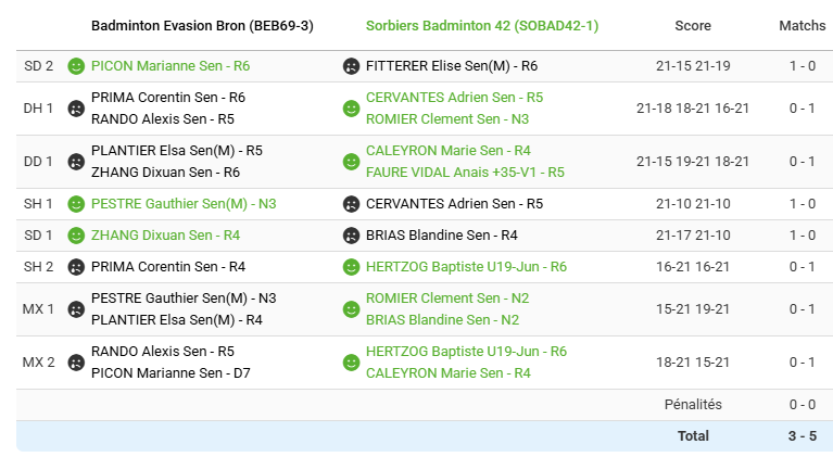 Après deux sets à sens unique, les deux équipes sont enfin égales et le score est serré. La tension monte avec l’approche imminente du dénouement et la pression se fait ressentir. Les décibels montent, les joueurs célèbrent leurs réussites et se plaignent de leurs échecs, le jeu n’a pas su désigner de vainqueur, c’est donc le mental qui choisira la paire gagnante. Et à ce petit jeu, après des derniers points tous plus tendus les uns que les autres, ce sont les sorbérans qui sortent vainqueurs. Baptiste et Souris réalisent l’exploit, malgré un écart de classement vertigineux, 21-19 au 3ème set, nous célébrons évidement cette performance magistrale, mais il faut encore gagner un match pour empocher un bonus défensif, et comme souvent, c’est le mixte 1 qui ferme la marche. 2-5.