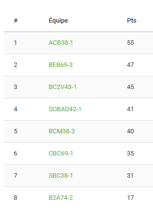 Tous ces rebondissements font que le classement retrouve le même état qu’avant la journée. Crolles reste loin devant et assure sa 1ère place devant Bron et Brives qui se battront pour la seconde. So’Bad pointe toujours à la 4ème place, à 1 point de Meylan, et avec une avance de 6 points par rapport à la zone rouge.